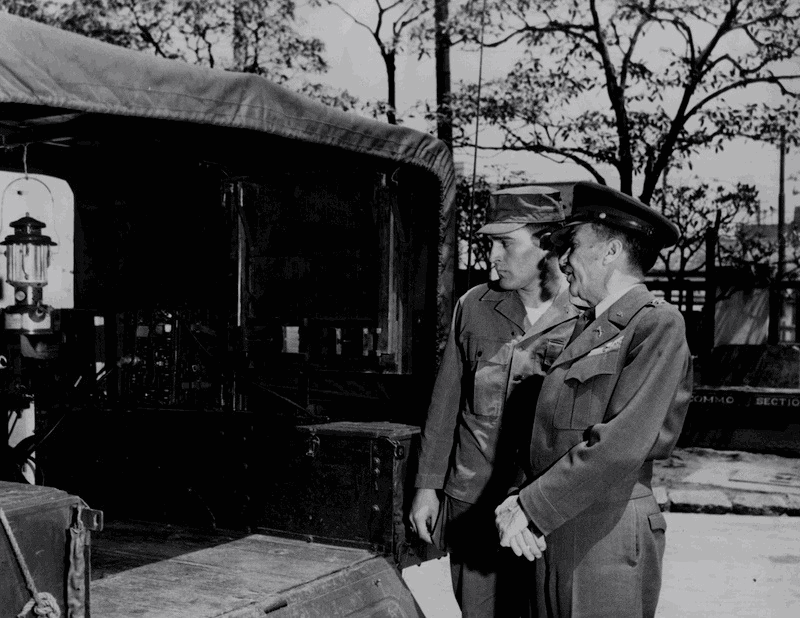 Photo A0233: MG Edwin Parker (right) Provost Marshal U.S. Army talks with CPL Jack Gabel (Fresno, California) a radio repairman of HQ Company, 720th Military Police Battalion, Headquarters & Service Group, General Headquarters, Far East Command, during an inspection tour of the Battalion cantonment at Camp Burness in Tokyo, Japan on 2 May 1952. Official U.S. Army photograph 1-3194-2/FEC-52-11842, by PFC Irwin I. Mark, (CJ) 71st SG SV Battalion.