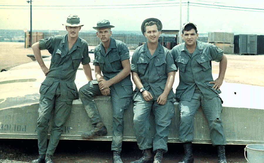 Photo G1330: Members of the B Company, 720th MP Battalion, River Patrol Unit "River Rats," in the Battalion Motor Pool in 1968. Left to right; 1-Unidentified, 2-SP/4 Rainer "Hippie" Trappe, 3-Unidentified, 4-SP/4 Harold Pritchard. If you can identify any of these men use this Email Link. Courtesy of SP/4 Ranier Hippie Trappe, B Company, 720th MP Battalion, 89th MP Group, 18th MP Brigade, March 1968 to March 1969. |