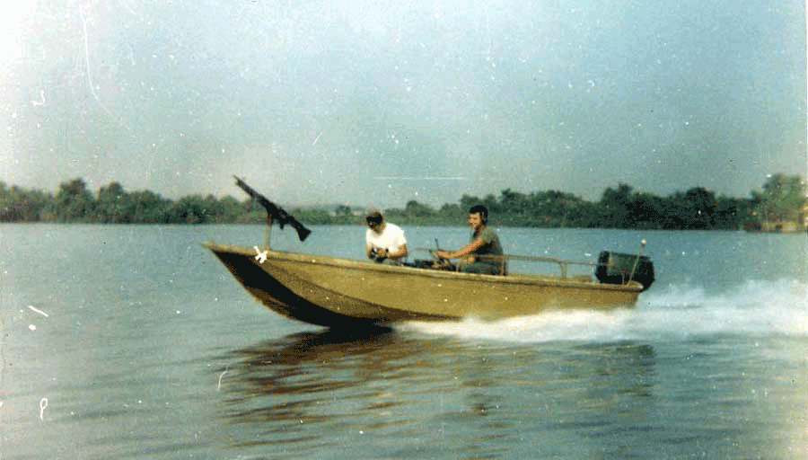 Photo G1501: SP/4 Harold Pritchard (driver) and Richard Hicks members of the B Company, 720th MP Battalion River Patrol Unit in their Boston Whaler Skimmer on the Dong Nai River, Vietnam in 1968. Courtesy of SGT Richard D. Hicks, B Company, 720th MP Battalion, 89th MP Group, 18th MP Brigade, September 1967 to July 1968. |