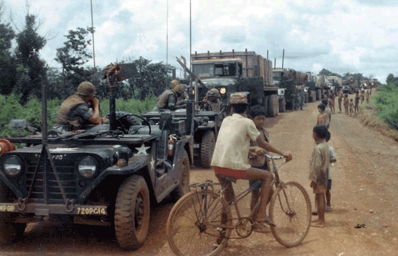 Photo G2359: Jeep C14 “The Frog” of C Company, 720th MP Battalion, 89th MP Group, 18th MP Brigade in the lead waiting during a break in the 3 to 7 October 1970 Cam Ranh Bay Convoy escort in Vietnam. Courtesy of SGT Lawrence K. Greenwood, C Company, 720th MP Battalion, 89th MP Group, 18th MP Brigade, July 1970-May 1971. |
