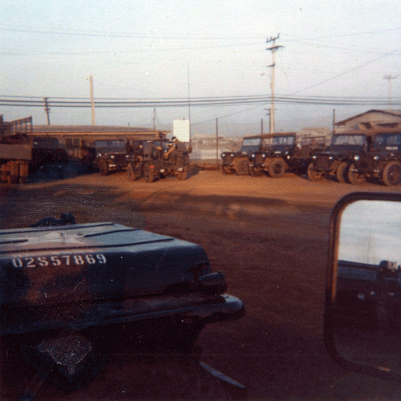 Photo G2672: B Company, 720th MP Battalion, 89th MP Group, 18th MP Brigade compound Motor Pool, Long Binh Post, III Corps Tactical Zone, Vietnam in 1971. Courtesy of SP/4 Marion Carl "Pete" Foster, B Company, 720th MP Battalion, 89th MP Group, 18th MP Brigade, August 1971-April 1972. |