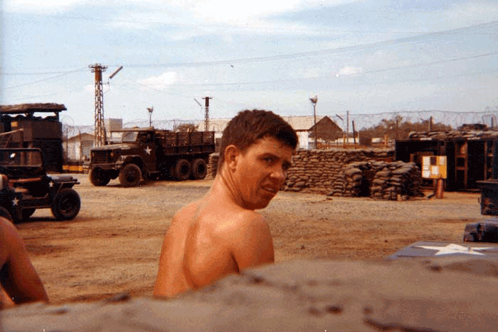 Photo G2681: Unidentified communications specialist for B Company, 720th MP Battalion, 89th MP Group, 18th MP Brigade in the lot to the rear of their compound building at Vinh Long, IV Corps Tactical Zone, Vietnam in 1971. If you can identify this soldier use this Email Link. Courtesy of SP/4 Marion Carl "Pete" Foster, B Company, 720th MP Battalion, 89th MP Group, 18th MP Brigade, August 1971-April 1972. |