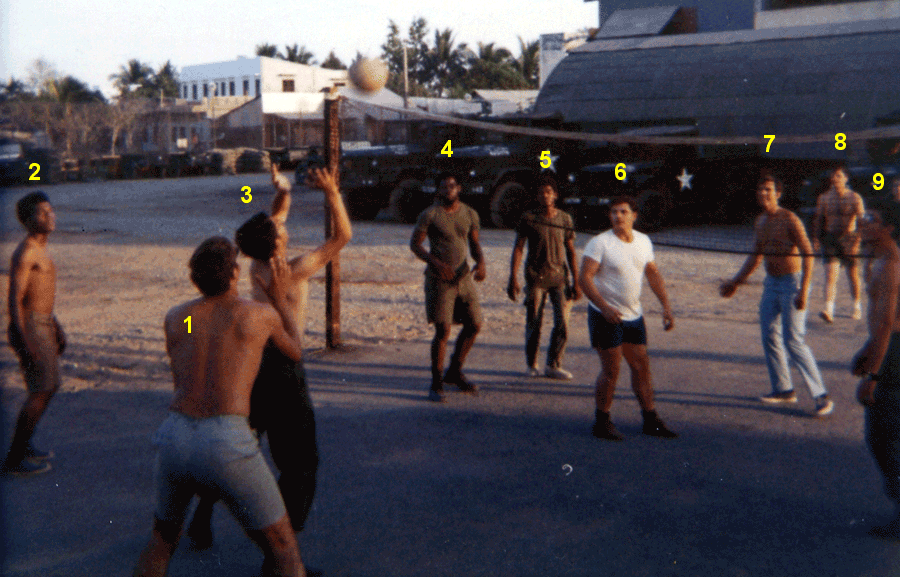 Photo G2740: Members of B Company, 720th MP Battalion, 89th MP Group, 18th MP Brigade playing basketball at the Vinh Long Detachment, Vietnam in 1971. 1- SP/4 Jerry Bishoff, 2- Unidentified, 3- Unidentified, 4- Unidentified, 5- Unidentified, 6- Unidentified, 7- Unidentified, 8- Unidentified, 9- Unidentified. If you can identify these soldiers use this Email Link. Courtesy of SP/4 Marion Carl "Pete" Foster, B Company, 720th MP Battalion, 89th MP Group, 18th MP Brigade, August 1971-April 1972. |
