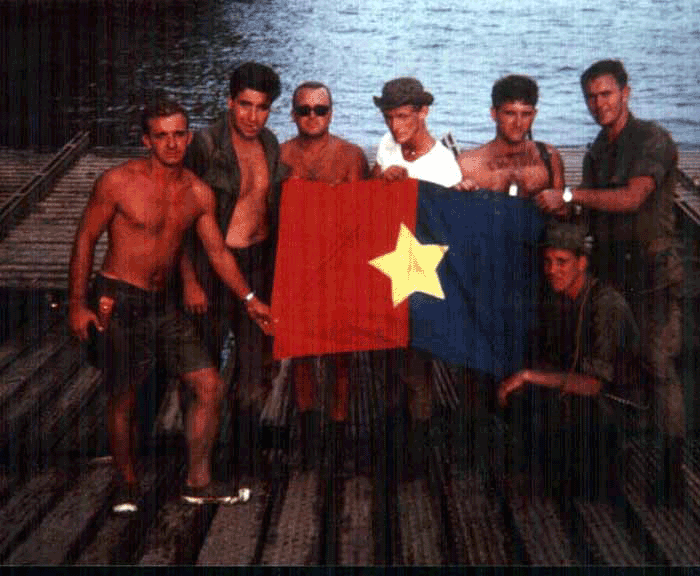 Photo G3065: Members of the C Company, 720th MP Battalion, 89th MP Group, 18th MP Brigade, River Patrol unit at their boat docks display the VC flag they seized from an enemy base camp on the Buong River on 22 January 1968. From left to right: SP/4 Larry W. Fisher, SP/4 Anthony L. Aceto, PFC Arthur C. Simpson, SP/4 William P. Collins, Jr., SP/4 Donald E. Hering, SPC/4 Jerry C. Clayburn, and SP/4 Richard G. Silver (kneeling). Courtesy of SP/4 Jerry C. Claburn, C Company, 720th MP Battalion, 89th MP Group, 18th MP Brigade, Vietnam, May 1967-May 1968. |