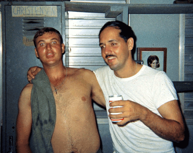 Photo G2301: Left to right, SP/4’s William Branning and Kenneth M. Arel, of A Company, 720th MP Battalion, 89th MP Group, 18th MP Brigade, in their barracks on Long Binh Post, Vietnam, in 1970. Courtesy of SP/4 George E. Wellock, A Company, 720th MP Battalion, December 1969 to February 1971. |