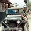 Another field modification that disappeared from most jeeps after a few years was the angle iron post welded to the front bumper and designed to cut taunt-wire traps strung across the roadway by the enemy hoping to decapitate the front seat passengers. Each company conducting convoy escort or night patrols in the more remote roadways had one or two jeeps with the wire cutter attached. |